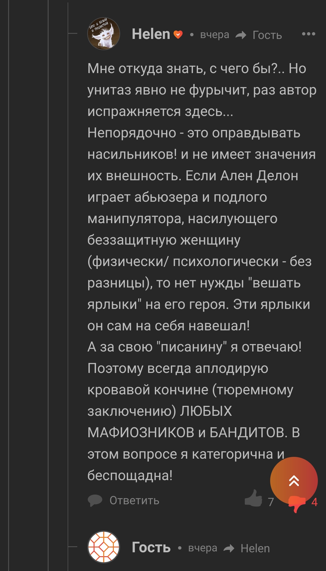 Мне откуда знать, с чего бы?.. Но унитаз явно не фурычит, раз автор испражняется здесь... Непорядочно - это оправдывать насильников! и не имеет значения их внешность. Если Ален Делон играет абьюзера и подлого манипулятора, насилующего беззащитную женщину (физически/ психологически - без разницы), то нет нужды "вешать ярлыки" на его героя. Эти ярлыки он сам на себя навешал! А за свою "писанину" я отвечаю! Поэтому всегда аплодирую кровавой кончине (тюремному заключению) ЛЮБЫХ МАФИОЗНИКОВ и БАНДИТОВ. В этом вопросе я категорична и беспощадна!