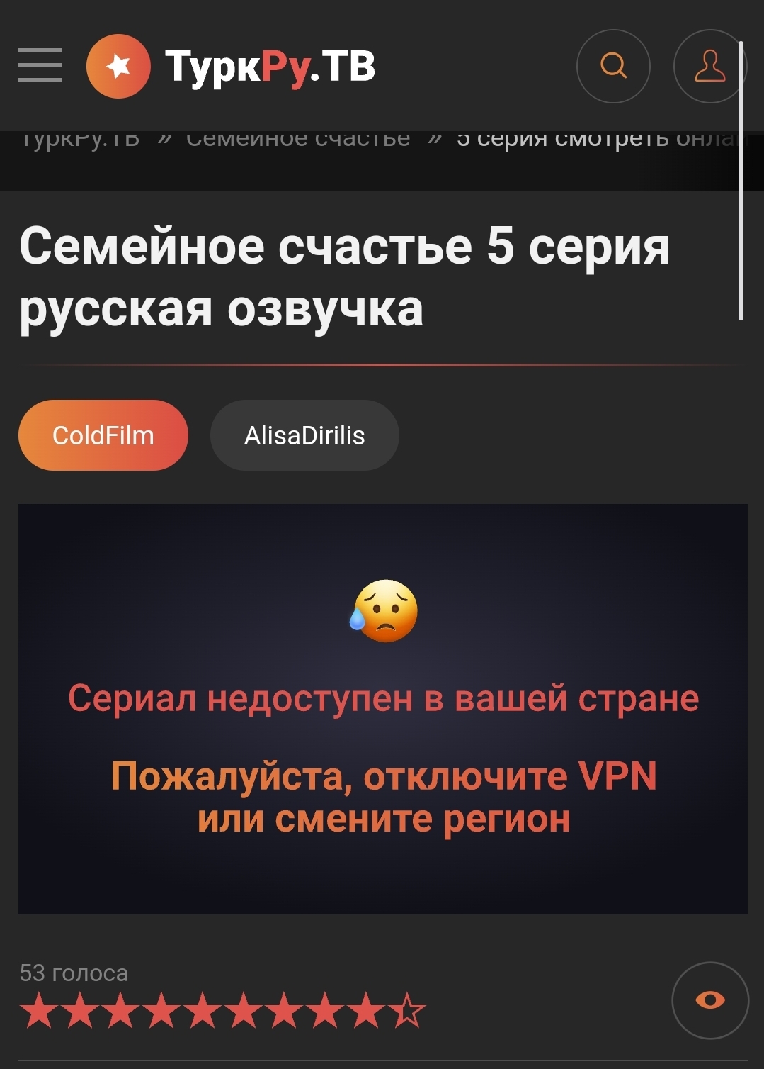 Уважаемые администраторы! Ни один сериал на вашем сайте не открывается. Появляется на серо экране чёрный овал в виде кольца, посередине чёрный треугольник. Красное кольцо начинает крутиться и замирает. Смотрю из Европы на телевизоре Sony, модельBRAVIA 4 UR2, версия ОС Android TV. НЕ работает только ваш сайт. Если возможно, прошу вас, решите эту проблему. И ещё: набираю в поисковой строке название сериала, н-р, " Любовь и наказание " - выходит "Не найдено", начинаю искать в разделе "Католог", тратя время на поиск, оказывается, этот сериал есть. Мне всегда очень нравился ваш сайт, очень не хочется расставаться с вами.